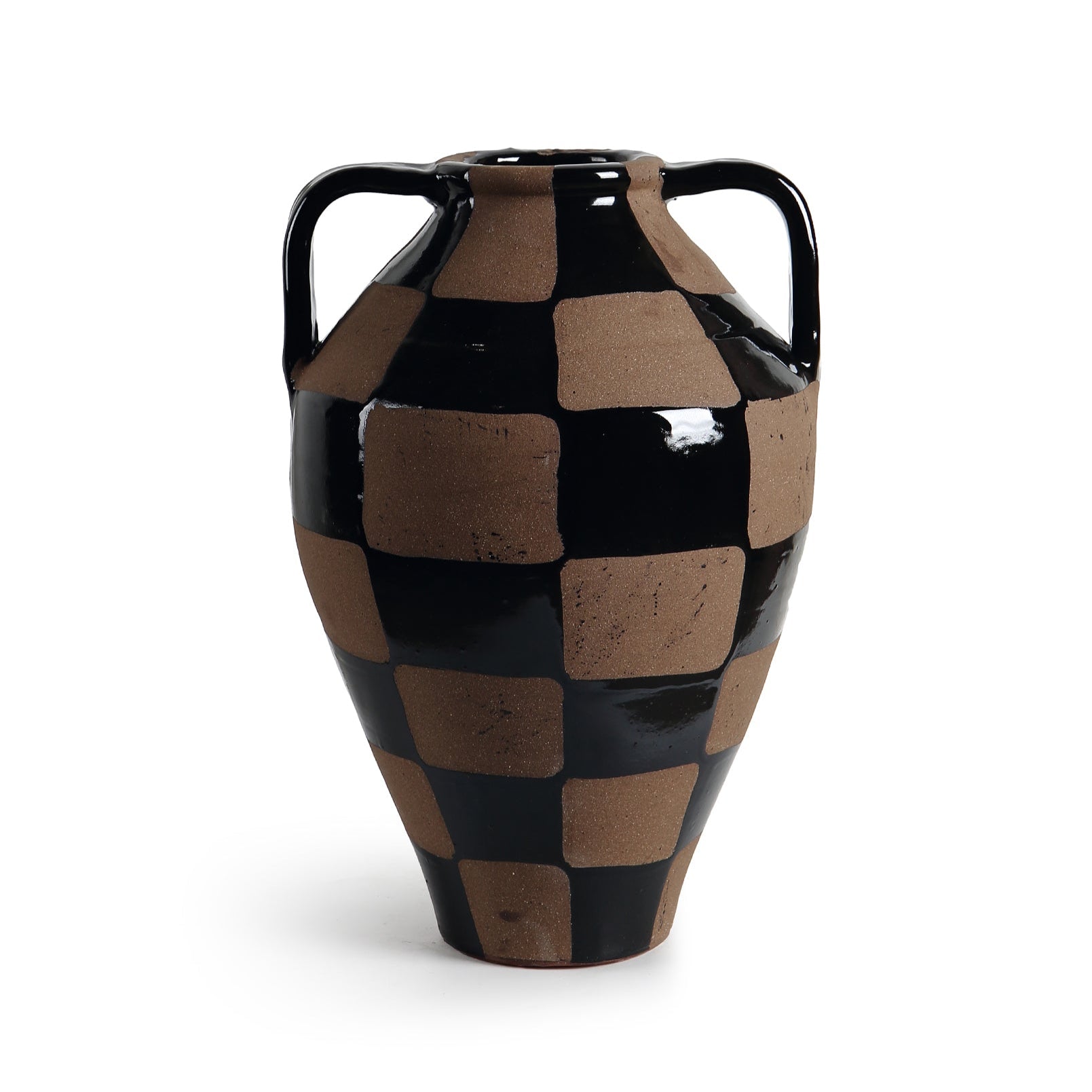 Jarrón de cerámica con diseño de cuadros en tonos marrón y negro, que aporta un contraste gráfico sutil. Su forma cilíndrica se complementa con pequeñas asas en la parte superior, evocando un estilo rústico con toques contemporáneos. Ideal como pieza decorativa o funcional.